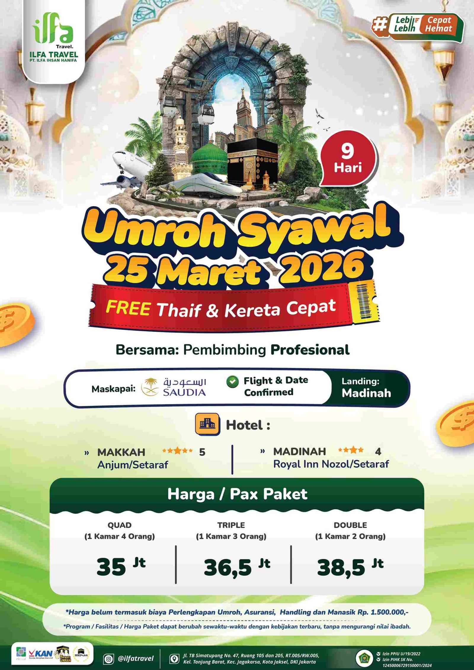 Berikut Harga Paket Umroh yang bisa Anda pilih di Ilfa Travel (harga dapat berubah sewaktu-waktu dengan kebijakan terbaru tanpa mengurangi nilai ibadah, konsultasikan langsung):