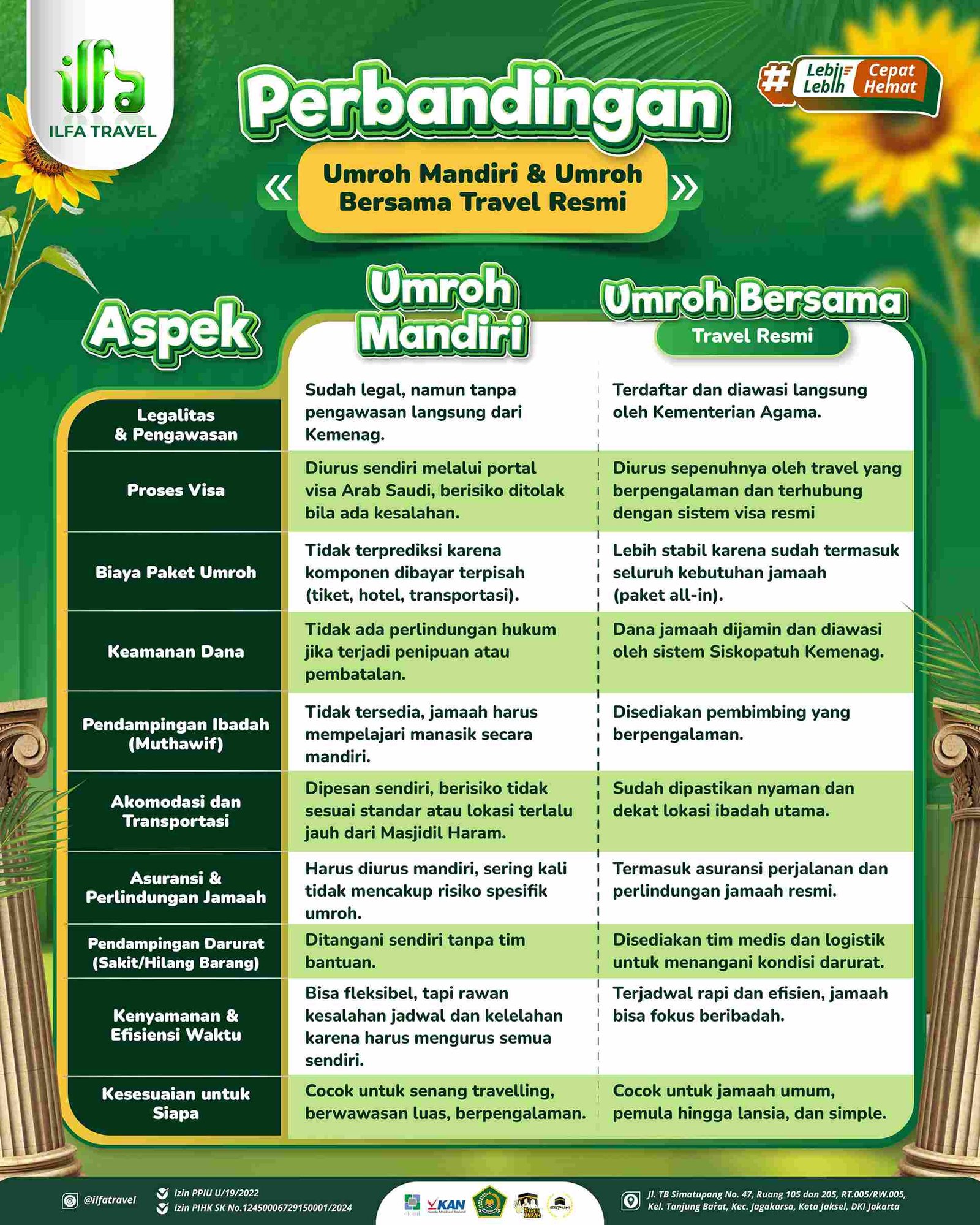 Memilih antara Umroh Mandiri atau Umroh dengan Travel Resmi tergantung kebutuhan Anda. Namun jika keamanan dan kenyamanan adalah prioritas, menggunakan Travel Umroh Terbaik di Indonesia seperti Ilfa Travel merupakan keputusan yang bijak.