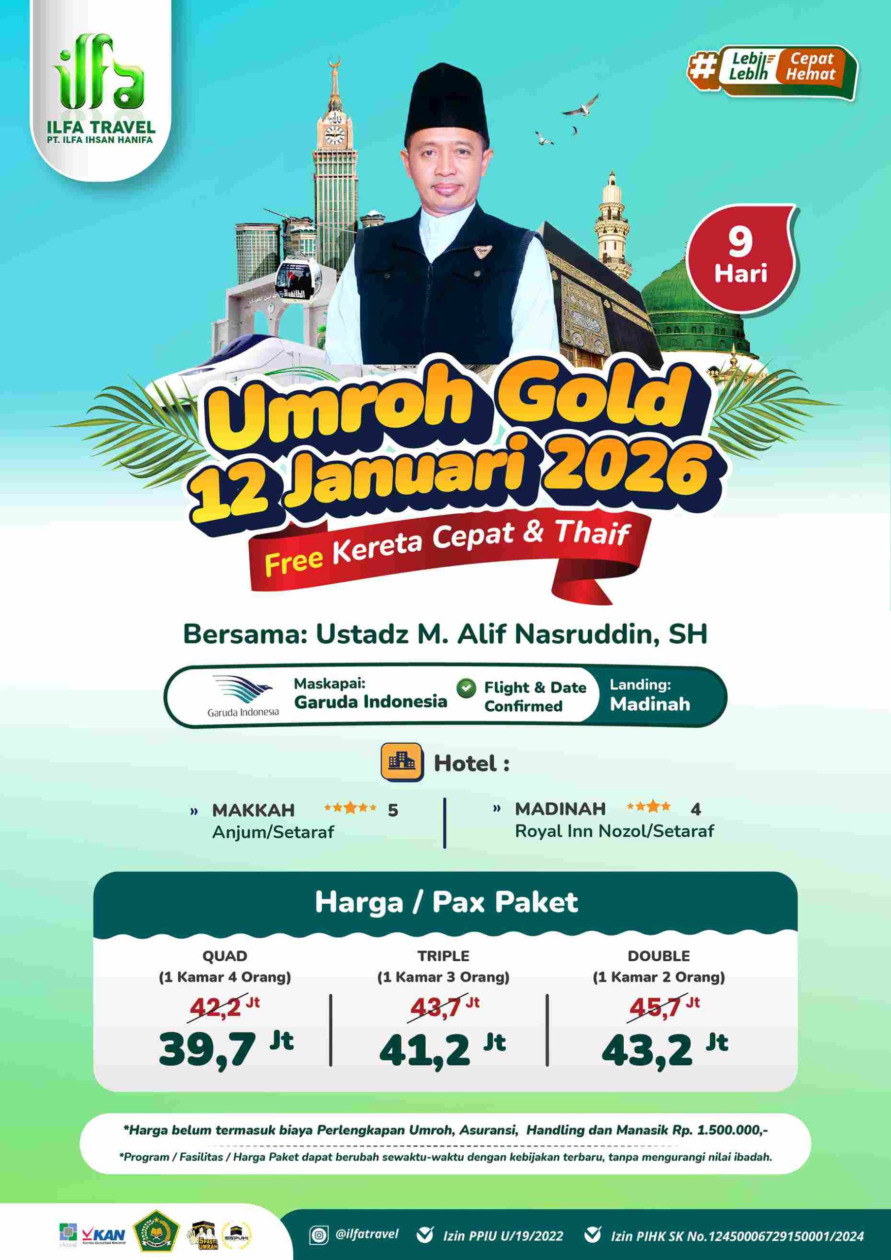 Umroh di Ilfa Travel memiliki 2 kategori yakni Reguler & Premium. Untuk Umroh Reguler secara pembiayaan lebih hemat, dengan pelayanan dan fasilitas Hotel bintang 3 dan berfokus hanya untuk melaksanakan Umroh saja. Untuk Biaya Umroh 2026Β Reguler berkisar Rp 35 jutaan. Sedangkan Biaya Umroh 2026 Premium berkisar Rp 39 jutaan. Berikut flyernya